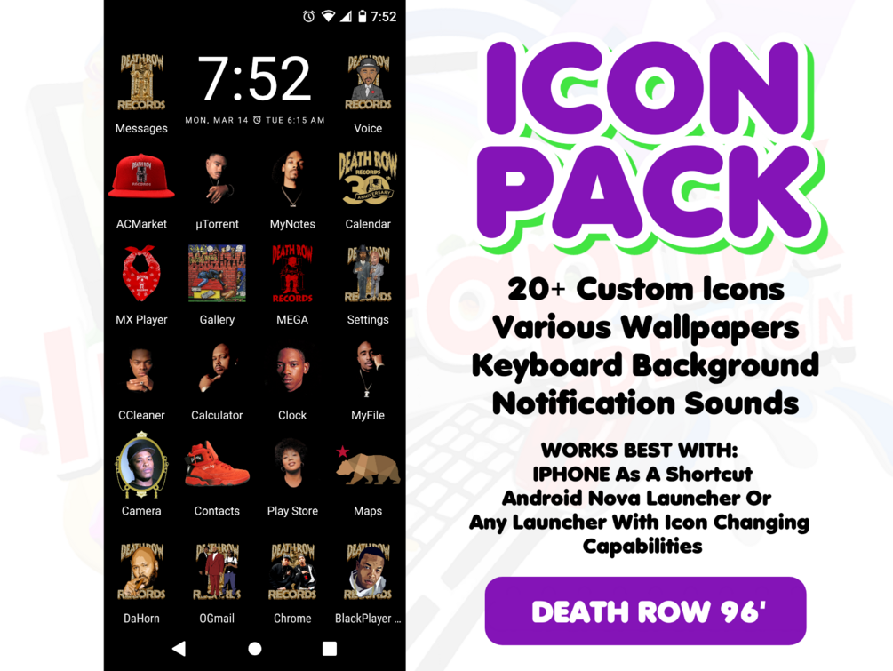 Death Row 96' Icon Pack 20+ Custom Icons, Different Wallpapers and Lockscreens also notification Sounds an Elements to create your own icons in one zip file!