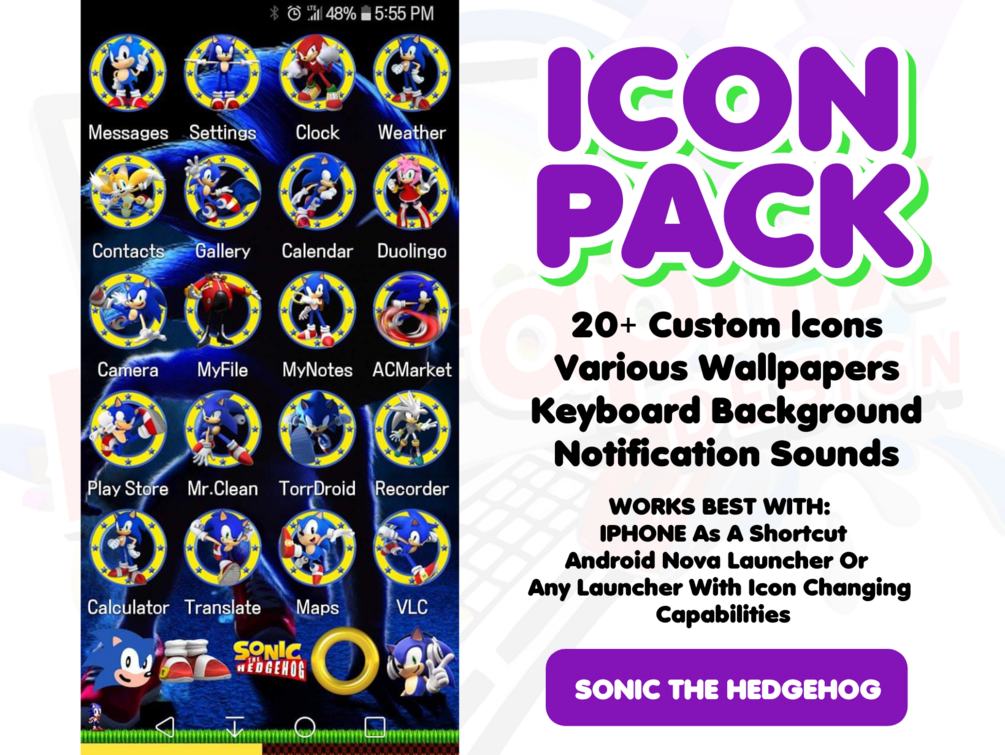 Sonic the Hedgehog Icon Pack 20+ Custom Icons, Different Wallpapers and Lockscreens also notification Sounds an Elements to create your own icons in one zip file!