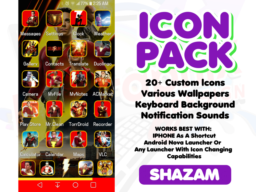 The Shazam! Iconpack 20+ Custom Icons, Different Wallpapers and Lockscreens also notification Sounds an Elements to create your own icons in one zip file!